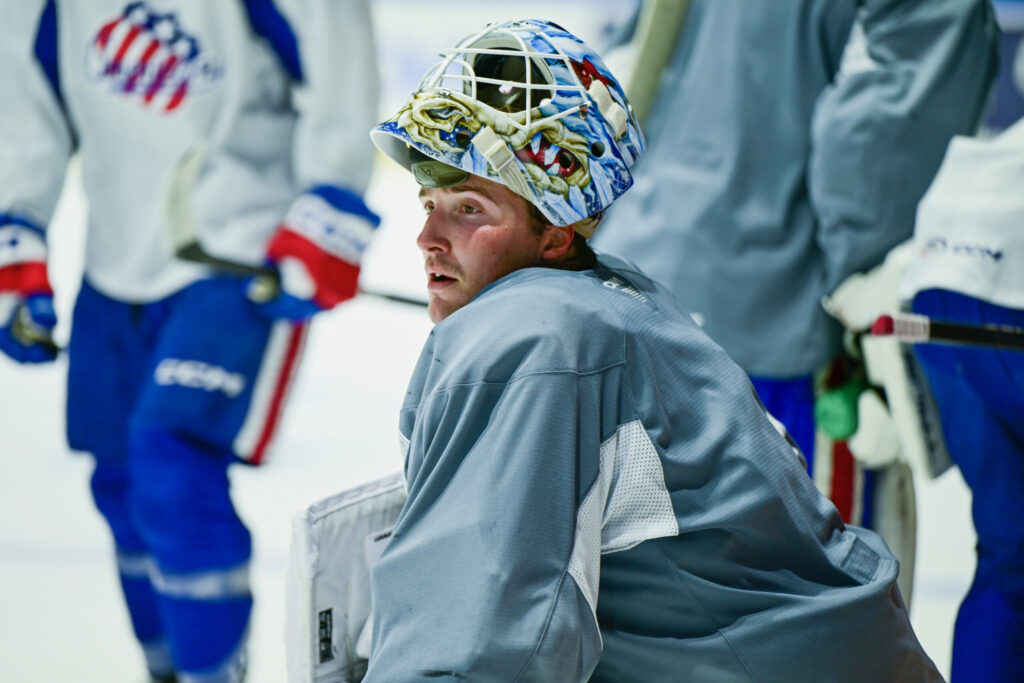 Ukko-Pekka Luukkonen takes a break during Tuesday’s practice with Rochester. ROCHESTER – On Tuesday, Buffalo Sabres goalie Ukko-Pekka Luukkonen walked