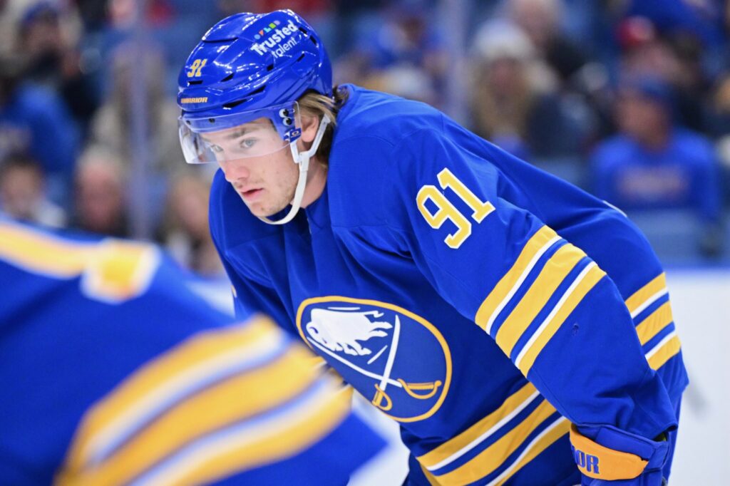 Buffalo Sabres newcomer Josh Doan (91) waits for the faceoff against Florida on Saturday at the KeyBank Center in Buffalo.