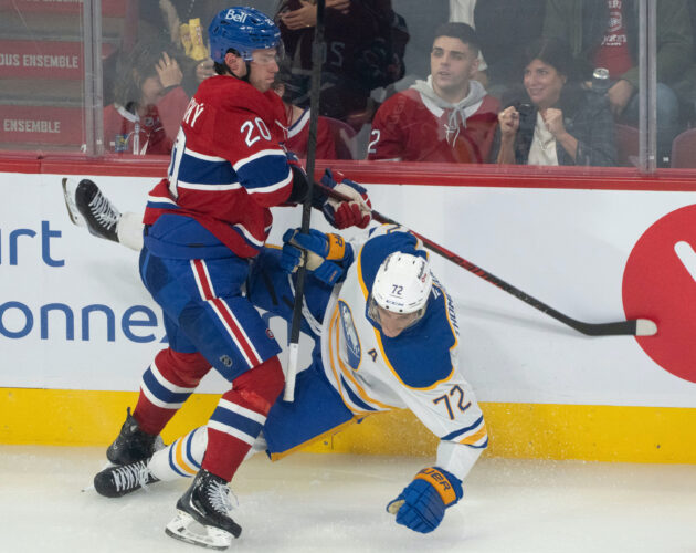 Buffalo Sabres’ Tage Thompson (72) is checked into the boards by Montreal Canadiens’ Juraj Slafkovsky (20) during the second period